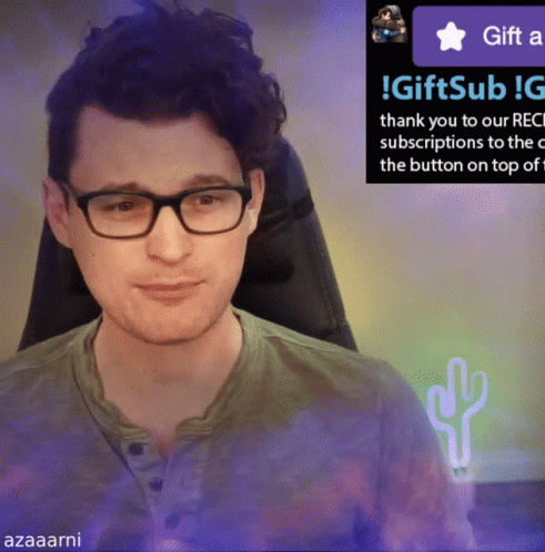 Content Description: a man wearing glasses sits in front of a sign that says gift sub