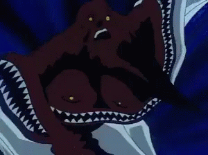 Content Description: a cartoon character is being attacked by a monster with a huge mouth .