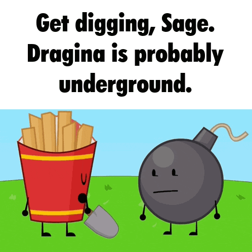 Content Description: a cartoon of a bucket of french fries next to a bomb that says get digging sage