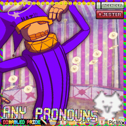 Content Description: a picture of a clown with the words any pronouns