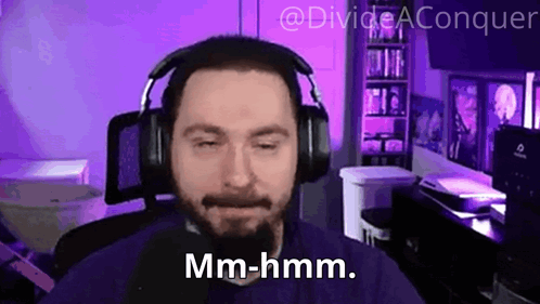 Content Description: a man wearing headphones is sitting in front of a purple background and says mm-hmm .