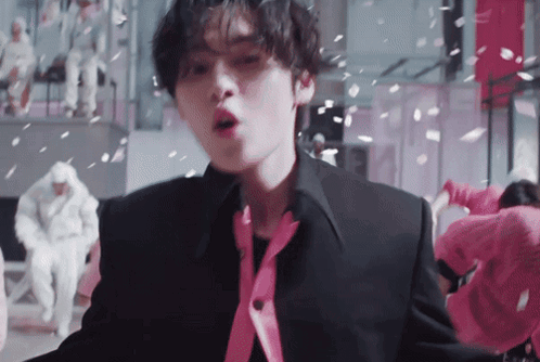Content Description: a man in a black suit with a pink tie is standing in front of a group of people