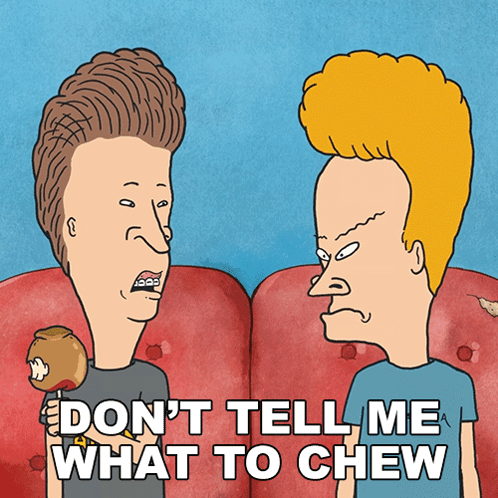 Content Description: a cartoon of beavis and butthead saying don 't tell me what to chew