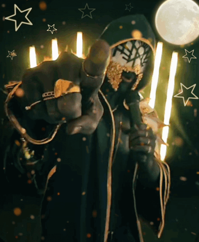 Content Description: a man with a mask on his face is holding a microphone and pointing