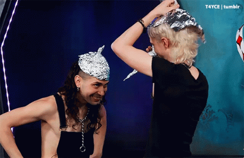 Content Description: a woman wearing a tin foil hat stands next to another woman wearing a tin foil hat