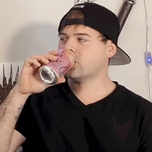 Content Description: a man wearing a black hat is drinking from a can with a smiley face on it