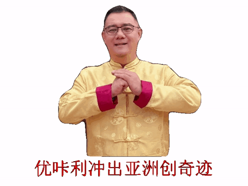 Content Description: a man wearing glasses and a yellow jacket with red sleeves is making a gesture with his hands