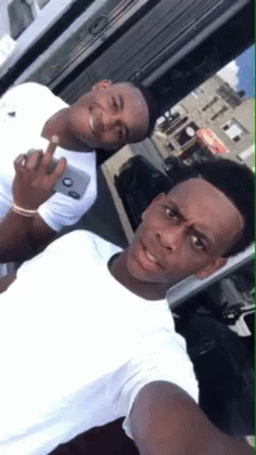 Content Description: two young men are posing for a picture and one is holding a phone that says ' abercrombie & fitch ' on it