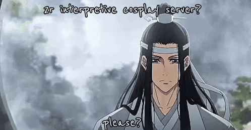 Content Description: a man with long hair is standing in front of a cloudy sky with the words " zr interpretive cosplay server please " below him