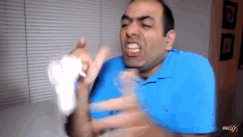 Content Description: a man in a blue shirt is making a funny face while holding a white object