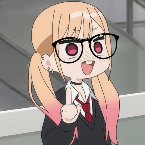 Content Description: a cartoon girl wearing glasses and a choker shows her tongue