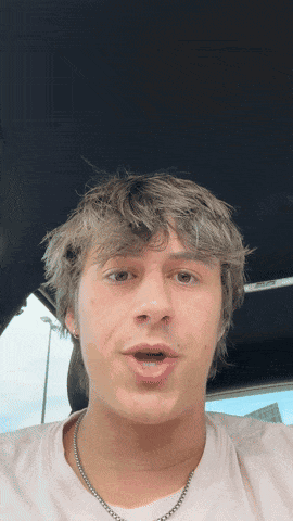 Content Description: a young man wearing a white t-shirt and a necklace looks surprised
