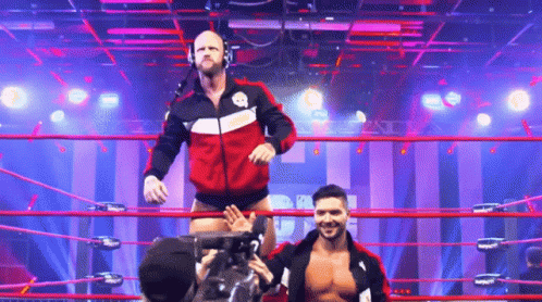 - Content Description: two men are standing in a wrestling ring with one wearing a red jacket that says ' smackdown ' on it