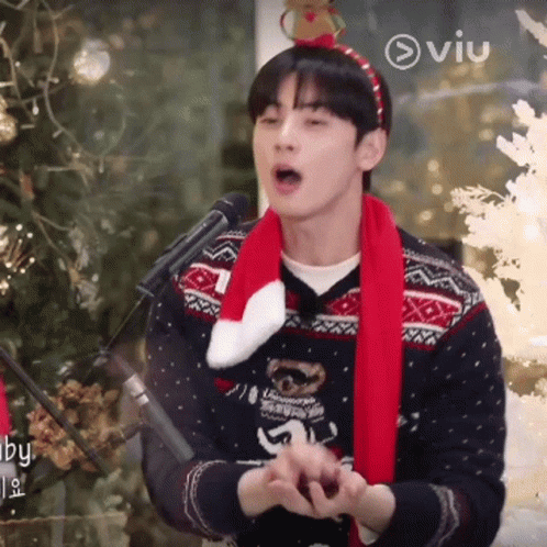 Content Description: a young man wearing a santa hat and scarf is standing in front of a microphone .