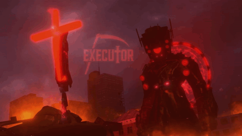 Content Description: a poster for a video game called executor with a red cross in the background