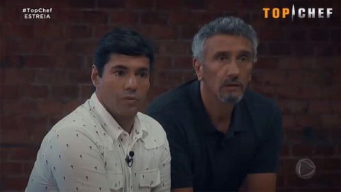 Content Description: two men are sitting in front of a brick wall with the words top chef on the bottom