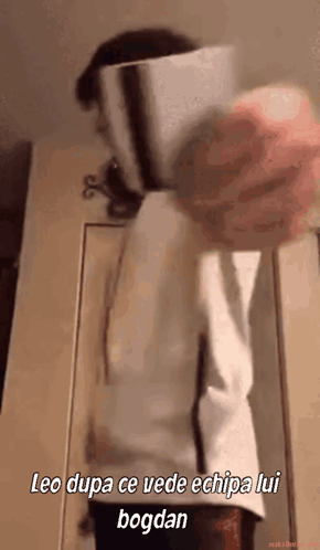 Content Description: a person is standing in front of a door with the words leo dupa ce vede echipa lui bogdan written on the bottom