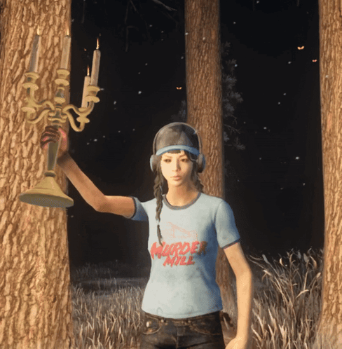 Content Description: a woman wearing a shirt that says murder mile is holding a candelabra