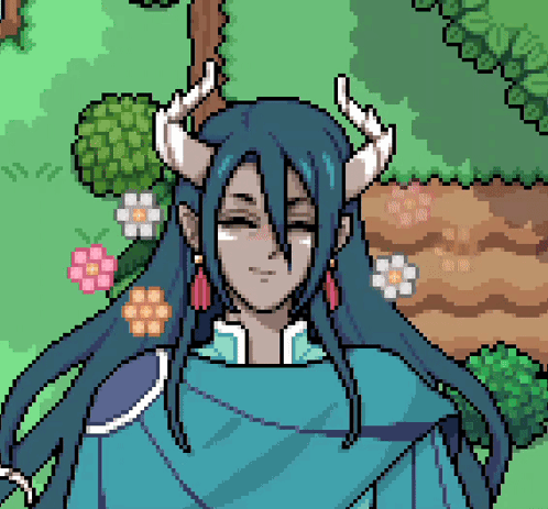 Content Description: a pixel art drawing of a woman with horns and flowers in her hair
