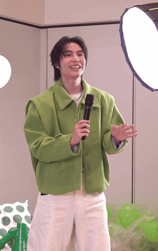 Content Description: a man in a green jacket is holding a microphone in front of a light