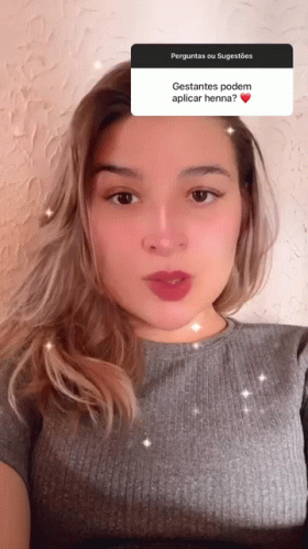 Content Description: a woman wearing a grey shirt has a question about henna on her face