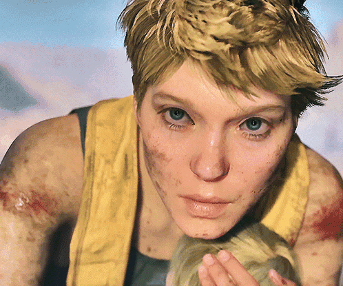 Content Description: a close up of a woman 's face with a yellow shirt on