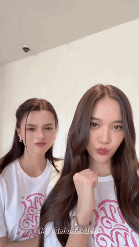Content Description: two women are standing next to each other and their shirts say mooduseries on them