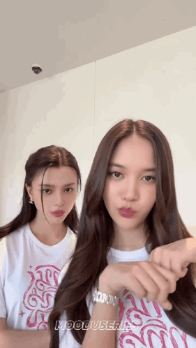 Content Description: two women are posing for a picture with the word hooduserie on the bottom right