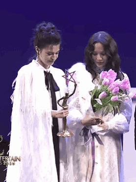 Content Description: two women standing next to each other holding flowers and a trophy with the year 2020 on the bottom