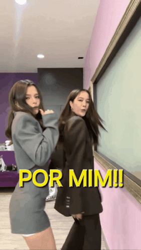 Content Description: two women are dancing in front of a pink wall with the words por mim written above them