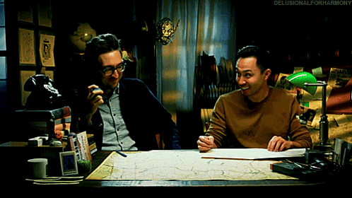 Content Description: two men are sitting at a desk with a green lamp and the words " delusionalforharmony " on the bottom right