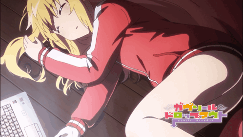 Content Description: a girl in a red jacket is laying on the floor next to a laptop computer