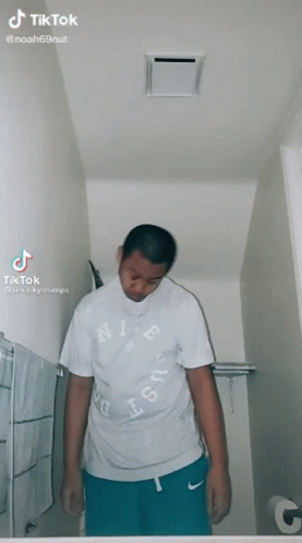 Content Description: a man wearing a white nike shirt is standing in a bathroom