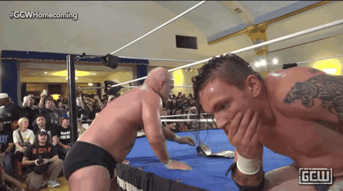 Content Description: two men in a wrestling ring with a ggw logo on the bottom