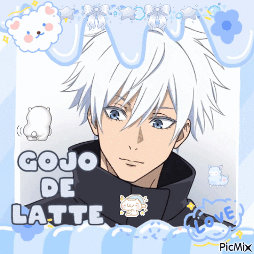 Content Description: a picture of a man with white hair and the words gojo de latte