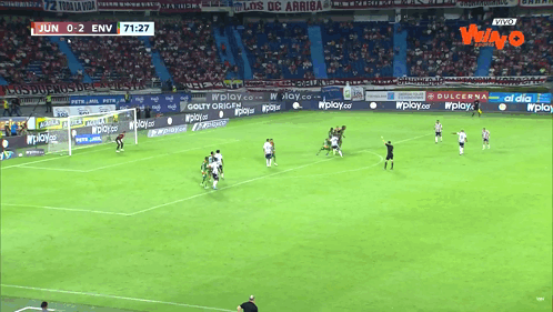 Content Description: a soccer game is being played in a stadium with ads for wplay.co