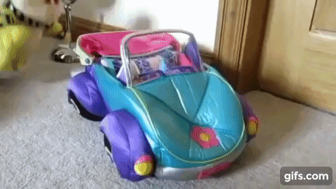 Content Description: a blue and purple toy car is sitting on the floor in a room .