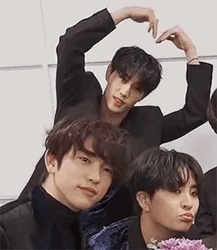 Content Description: a group of young men are sitting next to each other and making a heart shape with their hands .