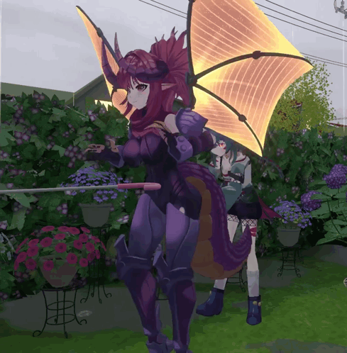 Content Description: a girl in a dragon costume stands next to a girl in a green dress