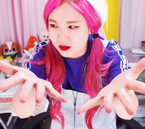 Content Description: a girl with pink hair is wearing a blue shirt and apron