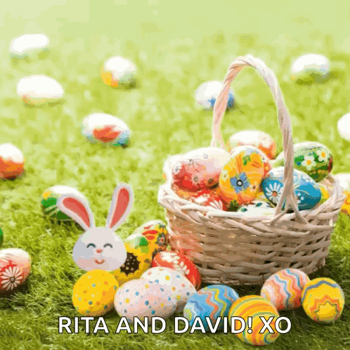 Content Description: a basket filled with colorful easter eggs and a bunny on the grass