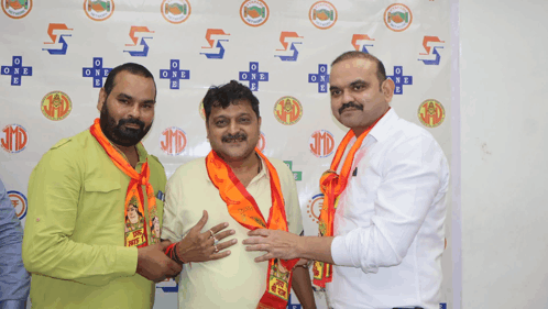 Content Description: three men are posing for a picture in front of a wall that says jnd