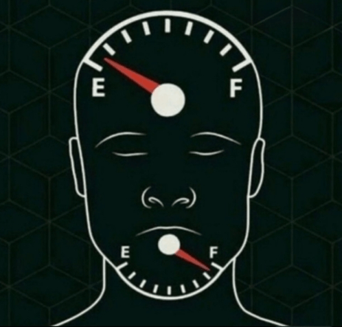 Content Description: a drawing of a man 's head with a fuel gauge pointing to e