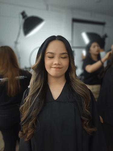Content Description: a woman with her eyes closed is wearing a black shirt with the letter a on it