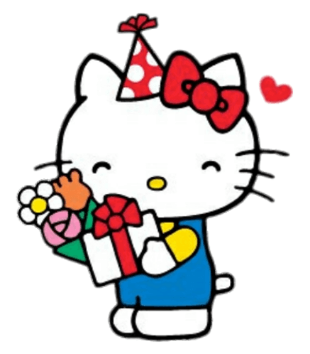 Content Description: hello kitty wearing a party hat is holding a bouquet of flowers and presents