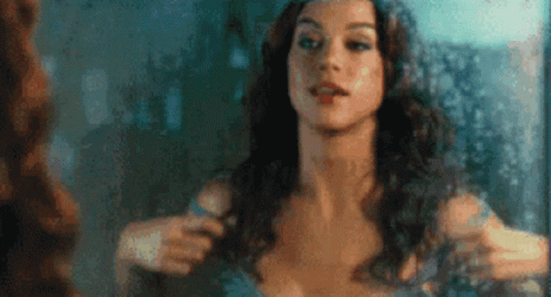 Content Description: a woman is looking at herself in a mirror and adjusting her bra .