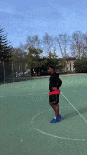Content Description: a man standing on a basketball court with his hands on his hips ..