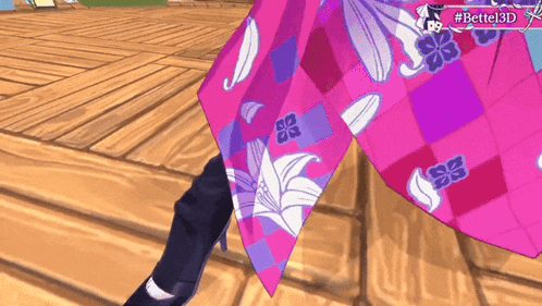 Content Description: a video game character is wearing a pink and purple floral dress