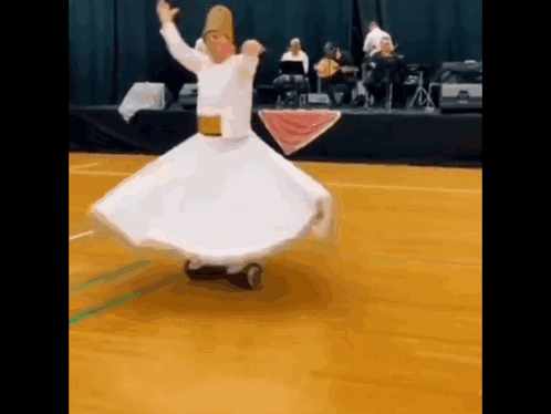Content Description: a man in a white skirt is dancing on a wooden floor .