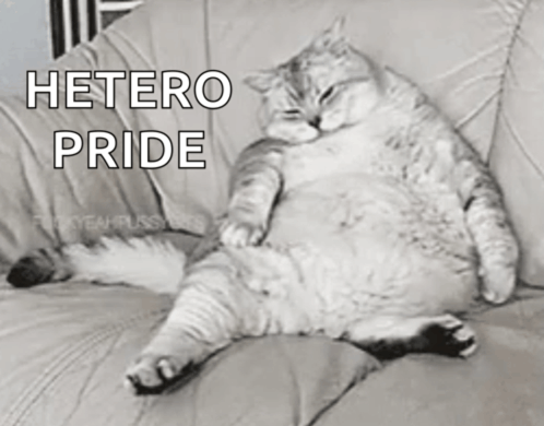 Content Description: a fat cat is laying on a couch with hetero pride written on the bottom
